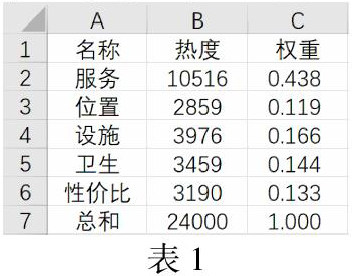 我们对问题一中的热度数据对景区及酒店的服务、位置、设施、卫生、性价比进行分析,在列表中卫生热度只有1931,而与其近似的干净则占热度3459,所以我们决定用干净的热度来表示卫生的热度。以及列表中性价比的热度为2237,与其近似的便宜热度为3190,及免费2360,考虑到有可能会有一句网评中都包含了这几个词语,所以我们决定用热度较高的便宜来表示性价比的热度。然后对这五个求权重得到下表: