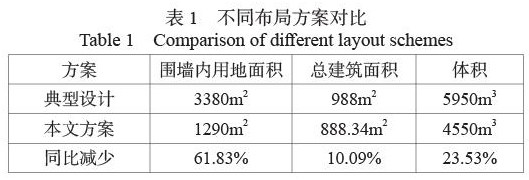 通过以上对站内建筑组成与组合的优化,变电站全站总建筑面积为888.34㎡,围墙内用地面积为1290㎡,与典型设计相比,本次设计方案使站内建筑的平面功能更加紧凑合理,建筑面积更加优化。两种方案对比见下表1。