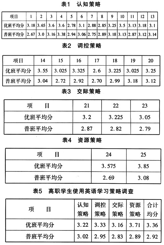 本次调查方式为问卷调查。其中问卷采用了抽样调查的方法,作者在所在学校非英语专业所在班中随意选取了优秀班40名和普通班230名高职高专学生作为调查对象。(调查表中简称优班和普班。)优秀班发放问卷40份,收回有效问卷40份;普通班发放问卷230份,收回有效问卷223份。并对两类数据进行比较,作描述性分析。采用目前由美国的语言学家R. Oxford设计的最有代表性的学习策略诊断工具——学习策略调查表Strategy Inventory for Language Learning(SILL)(见附录),共25项,其中涉及认知策略13项、调控策略7项、交际策略3项、资源策略2项。问卷采用5分等级制计分。平均得分4.5—5表示总是使用此类策略;3.5—4.4表示经常使用;2.4—3.4表示使用情况一般;1.5—2.4表示基本不使用;1.0—1.4表示几乎从不使用。(Oxford,R.,1990)