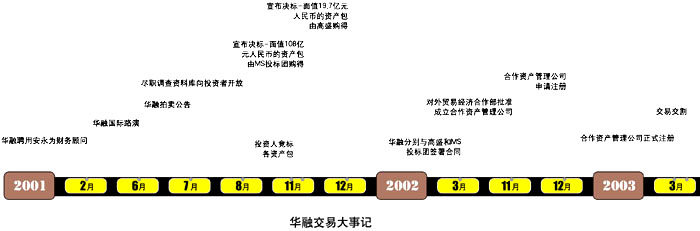 在安永的协助下,华融将第一批不良资产售予由摩根士丹利领导、并有雷曼兄弟、所罗门美邦等机构参与的一家国际投标团,第二批不良资产则售予了高盛。两单交易分别在2003年的2月和3月获得了政府有关部门的全面批准。
