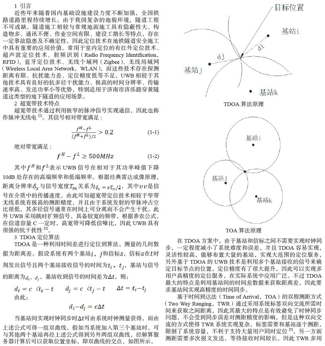 近些年来随着国内基础设施建设力度不断加强,全国铁路道路里程持续增长。由于我国复杂的地貌环境,隧道工程不可或缺。隧道施工相较与常规地面施工具有隐蔽性大、构造物多、通讯不便、作业空间有限、建设工期长等特点,存在一定事故隐患及不确定性,因此定位技术在地铁隧道安全施工中具有重要的应用价值。常用于室内定位的有红外定位技术、超声波定位技术、射频识别(Radio Frequency Identification,RFID)、蓝牙定位技术、无线个域网(Zigbee)、无线局域网(Wireless Local Area Network,WLAN),而这些技术存在探测距离有限、抗扰能力差、定位精度低等不足。UWB相较于其他技术具有良好的抗多径干扰能力、极高的时间分辨率、传输速率高、发送功率小等优势,特别适用于济南市济泺路穿黄隧道这类型的地下隧道的应用场景。