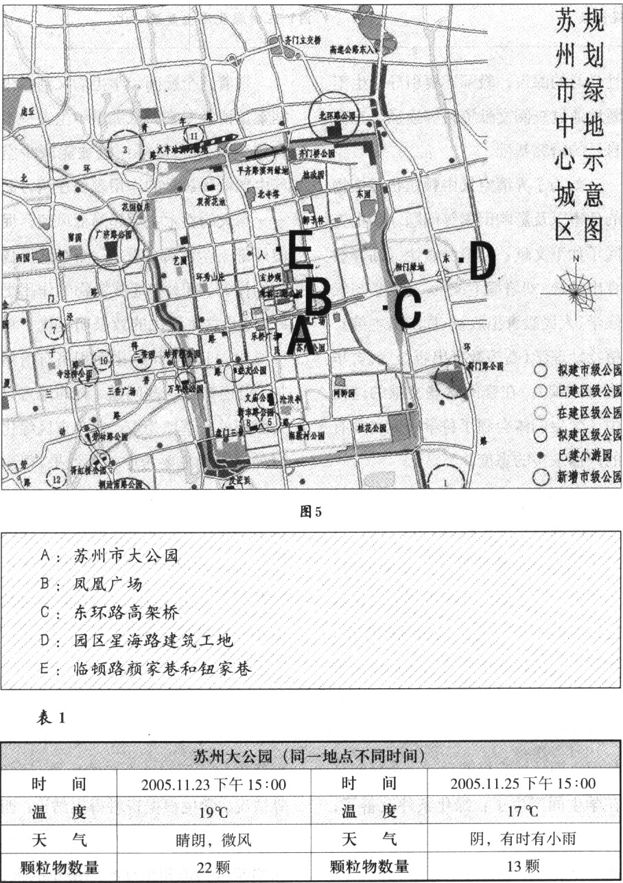 A.地点:苏州市一中对面大公园、市区主干道干将路与东环路交叉处的高架桥,工业园区的建筑工地和凤凰广场等。测量项目包括空气中颗粒物的数量、温度、风向、风速。
