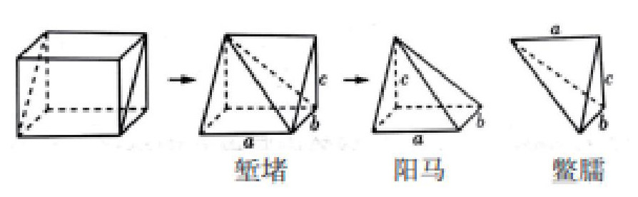 例:我国古代劳动人民在筑城、筑堤、挖沟、挖渠、建仓、建囤等工程中,积累了丰富的经验,总结出了一套有关体积、容积计算的方法,这些方法以实际问题的形式被收入我国古代数学名著《九章算术》中。《九章算术·商功》中有:“斜解立方,得两堑堵。斜解堑堵,其一为阳马,一为鳖臑。阳马居二,鳖臑居一,不易之率也。合两鳖臑三而一,验之以棊,其形露矣。”下图解释了这段话中由一个长方体得到堑堵、阳马、鳖臑的过程。已知堑堵的内切球半径为1,则鳖臑的体积的最小值为______。