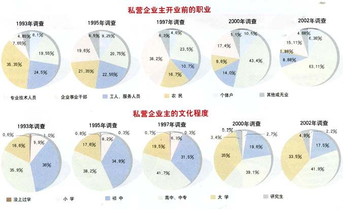 他们开业前的职业构成和文化构成也发生了很大变化:10年前的抽样调查数据显示,他们开业前的职业构成以农民、工人、服务人员为主体(占其总数的59.9%),而现在则以各类企事业单位的干部为主体(占其总数的63.1%)。