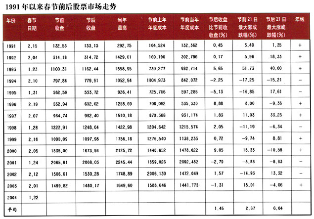 从1991年以来春节前后股票市场走势来看,除1999年外,一般一个年度行情状况(年K线收阴或收阳)是与春节前21个交易日最大涨跌幅是正或是负相一致的。一年之计在于春,春节前21个交易日也就是元旦前后,如果投资者看好当年行情,应该会选择元旦前后战略性买入,春节前21个交易日最大涨跌幅应该是正的。反之,如果投资者不看好当年行情,元旦前后战略性建仓就不会明显,春节前21个交易日最大涨跌幅往往是负的。因此,从2004年春节前21个交易日的最大涨跌幅就能够看出2004年全年行情的大致状况。