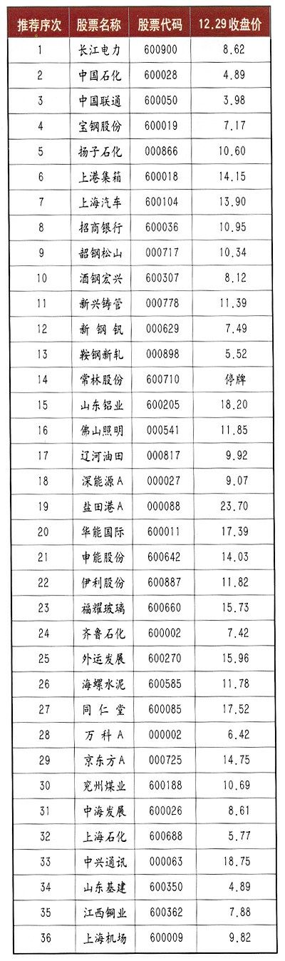 增仓时可供选择的股票有36只(见下表,依强烈推荐程度排列)。