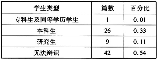 对专科生及同等学历的学生进行报道的只有一篇。其实这一类学生在实际的学生群体中占有很大一部分。对此报道较少,表明媒体对该群体学生的关注度不是很高。