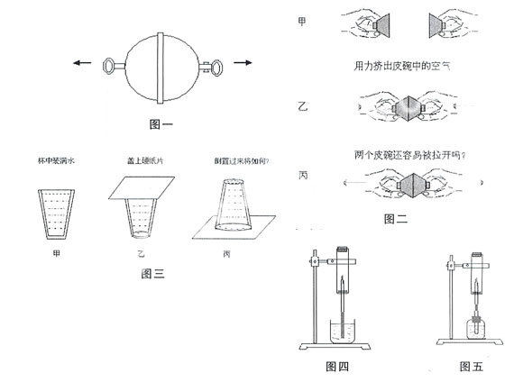 通过实验探索,学生能自己发现并得出结论:都是因为有外面空气压实验物体才有以上这些现象。接着我引导学生归纳出物理规律:大气对浸在它里面的物体都有压强,即大气压。