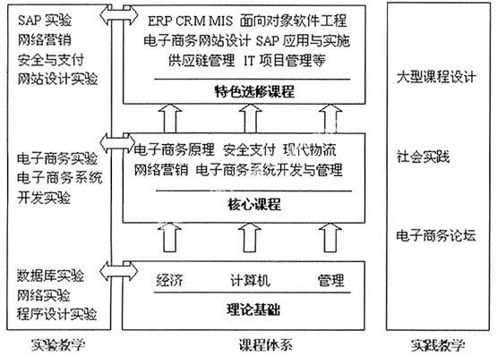 2.2.1 首先,该教学体系的核心为“基础+核心+特色”的课程体系,基础类课程主要依托于学院学科优势,打造学生扎实的经济、管理和计算机理论知识。经济类课程包括宏、微观经济学、政治经济学;管理学课程包括:管理学原理、生产运作与管理、统计学、市场营销;计算机类课程包括:程序设计、数据库原理、计算机网络与通信。核心课程主要阐述电子商务方面专业知识和理论,特色课程则是围绕着电子商务的应用与开发来构筑,主要是商务与技术相结合的特色选修课,其目的在于打造学生的实际分析和解决问题的能力。