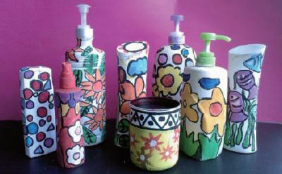 《新课标》指出“要指导学生利用身边的物品或废旧材料制作玩具、手工艺品等来美化自己的生活或开展其他活动。”在学生自主性美术活动中,我们在为学生提供多种工具和材料的基础上,尤其重视让学生收集一些生活中常见的废旧物品,如:旧报纸,塑料袋,一次性杯碟,碎布条,饮料瓶,包装袋等,这些材料来源于孩子的生活,随处可见,容易获得,孩子们是十分乐于摆弄它们。请孩子们用自已喜欢的方式进行美术表现活动,既可以培养了孩子们的想象能力和操作能力,同时收集的过程也促进了学生养成废物利用的习惯,形成节约资源的意识。每一次“变废为宝”的体验都是一次审美能力和创造能力的“追肥”。在教学《给瓶子变个样》一课时,我就让学生收集了大大小小的,各种材料的瓶子,给学生展开思维想像的空间,设计制作出很多有趣的作品,孩子们给瓶子穿上了各色的衣服,绘制了漂亮的图案等等。“装扮自己” 一主题教学时, 学生利用各种材料进行巧妙构思,制成服装、装饰品并自由表演。如:“奇异的服饰”(利用旧报纸等生活中的废旧材料设计制作服饰)、“漂亮的胸饰”、“服装贴花设计”都深受学生喜爱。“制作画册” 我让孩子们 模仿书籍装桢利用废旧材料将自己喜欢的绘画作品装订成具有个性化的画册,并相互交流自己的作品,现在孩子们还常会在习作中回忆起那节课。