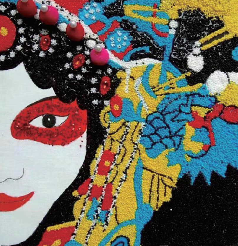 设计说明:画中人物为潮汕文化潮剧中的一名花旦角色。潮劇服饰透头饰会运用到很多珠子,因此想到用珠子粘成一副画,由五种不同颜色的珠子粘贴成不同色块,再用珍珠和毛球等加以点缀,形成一副以半边脸呈现的潮剧人物的珠子装饰画。